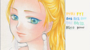 私個人としては、宝石のように多色でキラキラした瞳が好きなので、今回はつい複数のコピックの色を使ってしまいましたが、本来は淡〜濃い3色程度+0番とホワイトがあれば、初心者さんにとっては十分ではないかと思います。