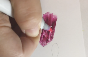 そのため、まず最初にマスキングペン(動画ではpebeoドローイングマーカーを使甩)を使って、宝石の表面のデコボコや光が当たる部分を保護して下準備を行います。