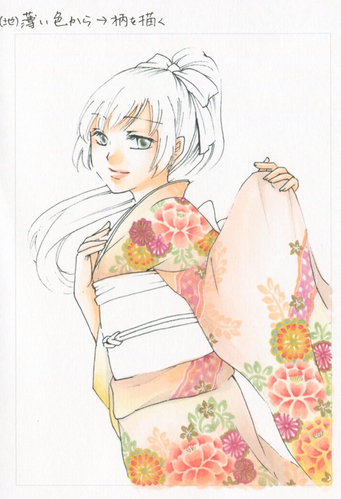 塗り方1:着物の生地を淡い色で塗る→柄を描く