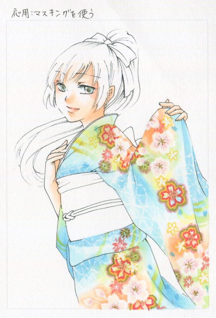 マスキングペンで模様を入れて上からコピックで塗るやり方です。着物の生地部分に点描でマスキングすると、絞り染めっぽい感じを表現できます。