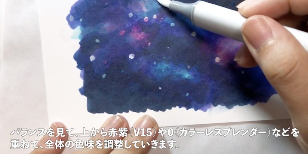 バランスを見て、上から赤紫(V15)や0(カラーレスブレンダー)などを重ね、全体の色味を調整します。